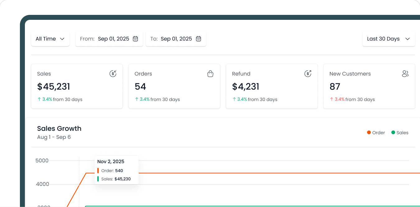 Track sales, orders, refunds, and customer activity with clear, real-time analytics.